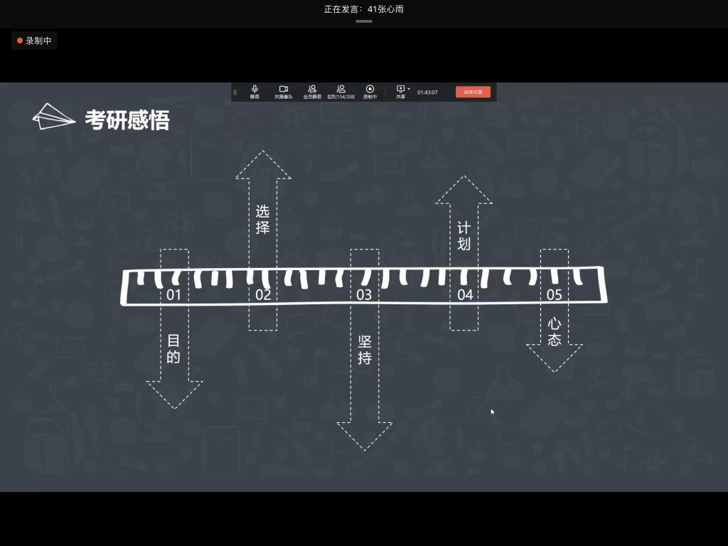 会议伊始,18会本1班孔润玉、18注会2班赫萌萌、18管会2班张心雨,以及18审计1班李双双依次进行了考研经验分享。她们从备考时间安排、各科学习方法、学习资料选择、如何调整心态、考研择校、复试技巧、考研经历等方面进行了详细的交流。孔润玉同学强调,备考过程中一定要保持好心态,平常心对待每一天的学习,不能盲目对比,不要过度疲惫,但需要保证高效率学习,良好的作息。张心雨同学提醒学弟学妹,备考前期要把基础知识学扎实,不要过度求快,量的积累很重要。
