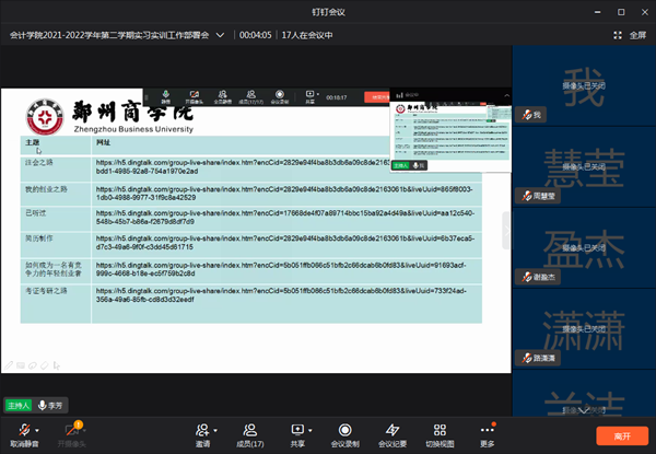 为进一步做实做细2022届毕业生毕业实习实训工作,不断强化实践教学管理水平,提升学生就业能力,5月9日晚,会计学院通过钉钉会议召开2021-2022学年第二学期认识实习及专业实习实训工作部署会,会计学院院长祝利芳、副院长刘金金及全体实习实训指导教师参加此次会议,会议由实践组组长李芳老师主持。