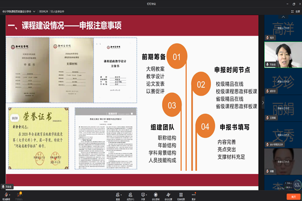 为进一步落实和推进课程思政建设工作,把课程思政建设作为落实立德树人根本任务的重要抓手,深入挖掘专业课程蕴含的思政元素和承载的教育功能,努力打造线上线下精品课,2022年5月13日,河南省精品在线开放课程负责人、河南省课程思政样板课主要参与者、会计学院刘金金副院长做题为《课程思政与优质课建设——如何打造课程线上线下精品课》的专题报告。会计学院院长祝利芳、各教研室主任及全体无课教师参加了此次线上报告会。