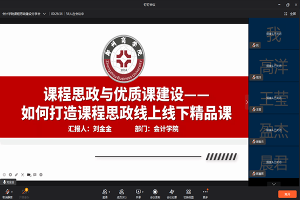 为进一步落实和推进课程思政建设工作,把课程思政建设作为落实立德树人根本任务的重要抓手,深入挖掘专业课程蕴含的思政元素和承载的教育功能,努力打造线上线下精品课,2022年5月13日,河南省精品在线开放课程负责人、河南省课程思政样板课主要参与者、会计学院刘金金副院长做题为《课程思政与优质课建设——如何打造课程线上线下精品课》的专题报告。会计学院院长祝利芳、各教研室主任及全体无课教师参加了此次线上报告会。