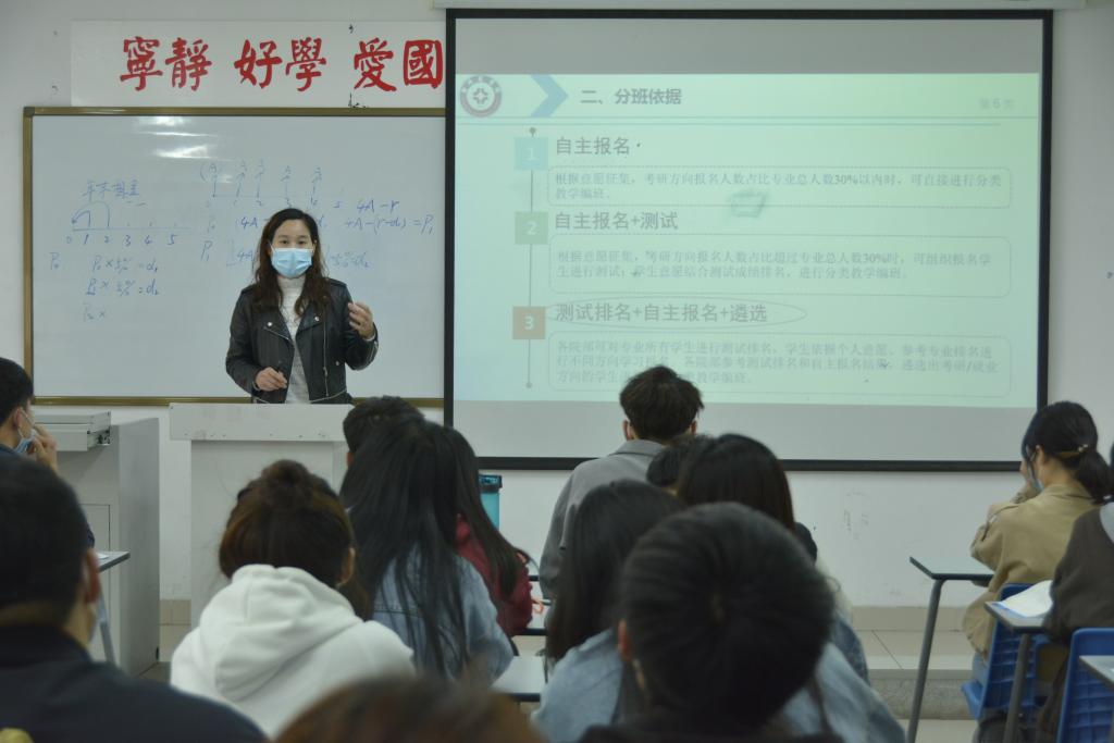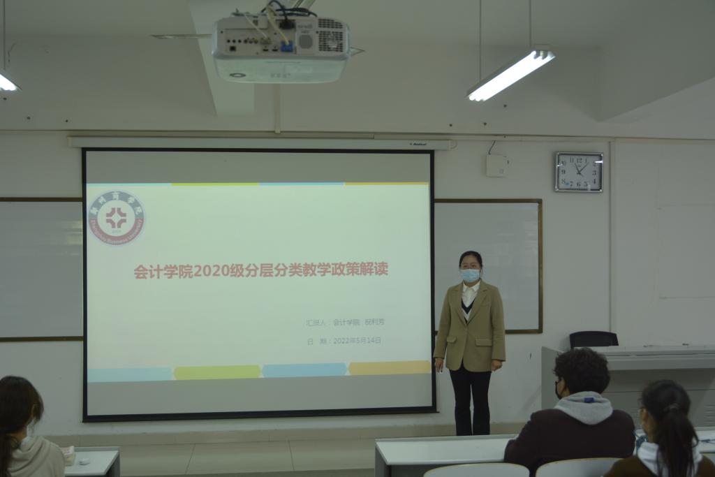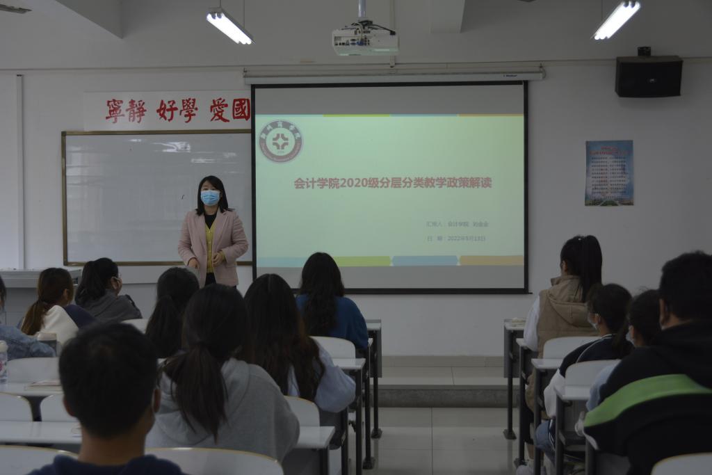 为充分尊重学生个性化发展需求,使其进一步明确学习目标,扎实做好2020级本科分层分类教学工作,促进学生高质量就业创业和考研升学,5月13-14日,会计学院院长祝利芳、副院长刘金金及各教研室主任分别深入2020级本科各个班级进行分层分类教学政策的宣讲,帮助学生了解政策,做好规划。