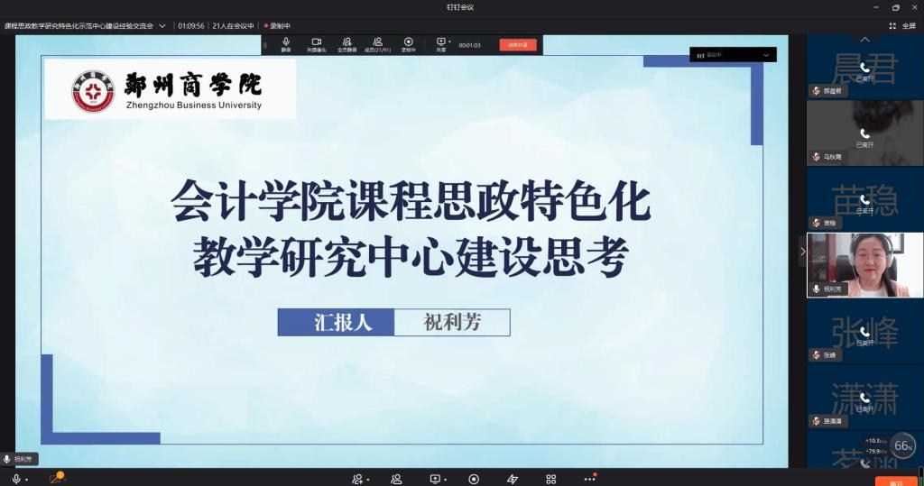 为提升教师课程思政建设的意识和能力,进一步推进课程思政教育教学改革,发挥会计学院课程思政示范中心的引领作用,5月27日上午,会计学院通过钉钉会议开展“课程思政教学研究特色化示范中心”线上会议,本次活动由会计学院课程思政研究中心主任祝利芳院长分享主题为《会计学院课程思政特色化教学研究中心建设思考》的报告,会计学院全体教师参加。