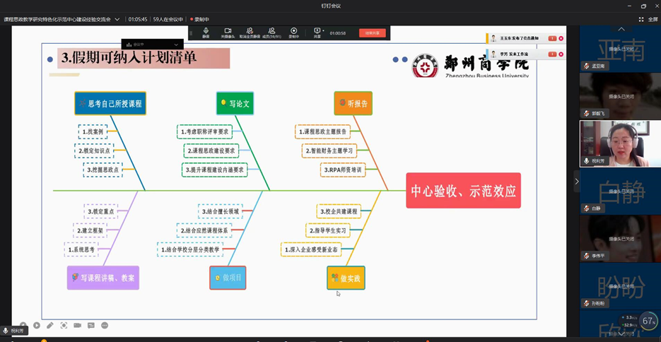 为提升教师课程思政建设的意识和能力,进一步推进课程思政教育教学改革,发挥会计学院课程思政示范中心的引领作用,5月27日上午,会计学院通过钉钉会议开展“课程思政教学研究特色化示范中心”线上会议,本次活动由会计学院课程思政研究中心主任祝利芳院长分享主题为《会计学院课程思政特色化教学研究中心建设思考》的报告,会计学院全体教师参加。