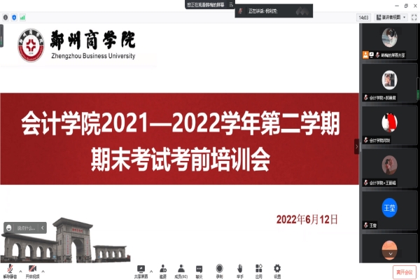 为保障期末教学工作秩序,确保2021-2022学年第二学期期末考试工作顺利进行,我院于2022年6月12日上午在线上召开了期末考试考前培训会,明确监考职责及线上监考注意事项,会计学院院长祝利芳、党委书记梁鹏、副院长刘金金、全体教师及辅导员参加此了次会议。