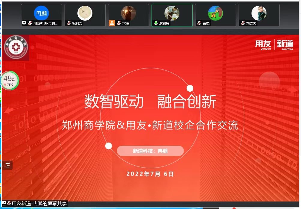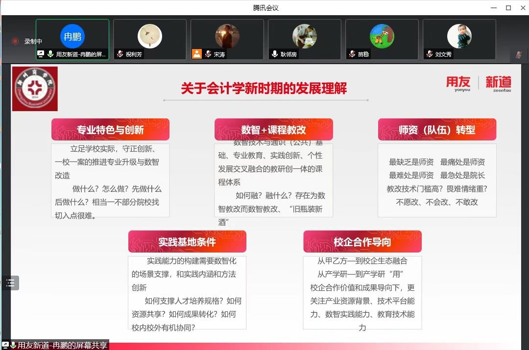为加快推进会计学专业数智化转型升级,培养符合新业态需求的智能化人才,以更高效地服务区域经济发展,7月6日,会计学院与用友新道科技股份有限公司携手“云端”共同召开了智能会计方向专业建设交流会。会计学院院长祝利芳、副院长刘金金、各教研室主任以及新道科技股份有限公司高级咨询顾问冉鹏、新道科技河南分公司生态合作总监耿邻房、新道科技河南分公司校企合作经理宋涛、新道科技河南分公司教学服务经理杨欣睿、新道科技河南分公司教学服务专员杨停停、新道科技河南分公司教学服务专员郭韩珂等人员参加了此次会议。