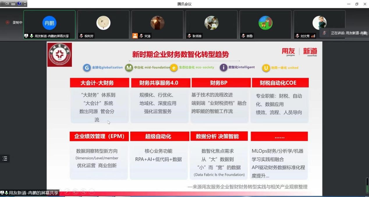 接着,新道科技股份有限公司高级咨询顾问冉鹏先生以“高校数智教改共识的关键行动”为主题,从会计学新时期的发展、智能会计交叉专业的融合创新、新时期企业财务数智化转型趋势等方面讲解数智化专业转型成为时代发展的必然趋势,同时展示了国内部分转型成功院校的专业设置和课程体系构建;新道科技河南分公司教学服务专员杨停停和郭韩珂两位老师分别为针对财务大数据分析与决策、财务机器人开发平台进行了讲解和具体演示。