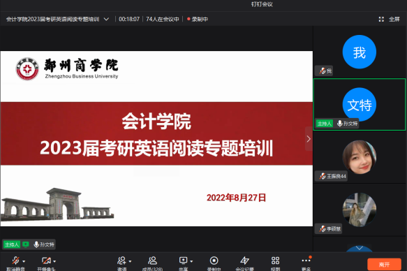 为进一步提升学风建设质量,深入落实点点官网本科分层分类教学工作要求,加强考研学习指导与服务工作,提升学生考研成功率,2022年8月27日-28日,会计学院邀请外语学院王静老师为2023届考研学生作考研英语阅读专项培训,此次培训由会计学院考研职能组孙文特老师主持,全体2023届考研学生参加会议。