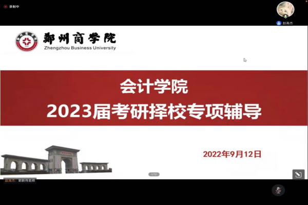 为帮助我院考研学子选择合适的学校,进一步提升我院学生考研成功率。2022年9月12日下午,会计学院邀请赵高杰老师为2023届考研学生作考研择校报考指导规划专项培训,此次培训由会计学院考研职能组组长武佳莉老师主持,全体2023届考研学生参加会议。