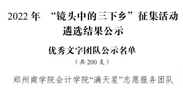 热烈祝贺taptap点点会计学院“满天星”志愿服务团队在2022年全国大中专学生志愿者暑期文化科技卫生“三下乡”社会实践“镜头中的三下乡”征集活动中,荣获优秀文字团队奖项。