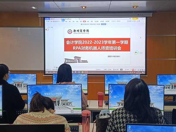 为提升会计学院学生的专业技能、开展会计学院21级本科学生的认识实习工作,2022年10月29日上午,会计学院联合新道公司,在3号教学楼202机房通过钉钉线上方式,进行RPA财务机器人师资培训。会计学院院长祝利芳、副院长刘金金、21注会专业认识实习指导教师、实验课教师及其他对RPA财务智能机器人感兴趣的老师共同参加了此次培训。
