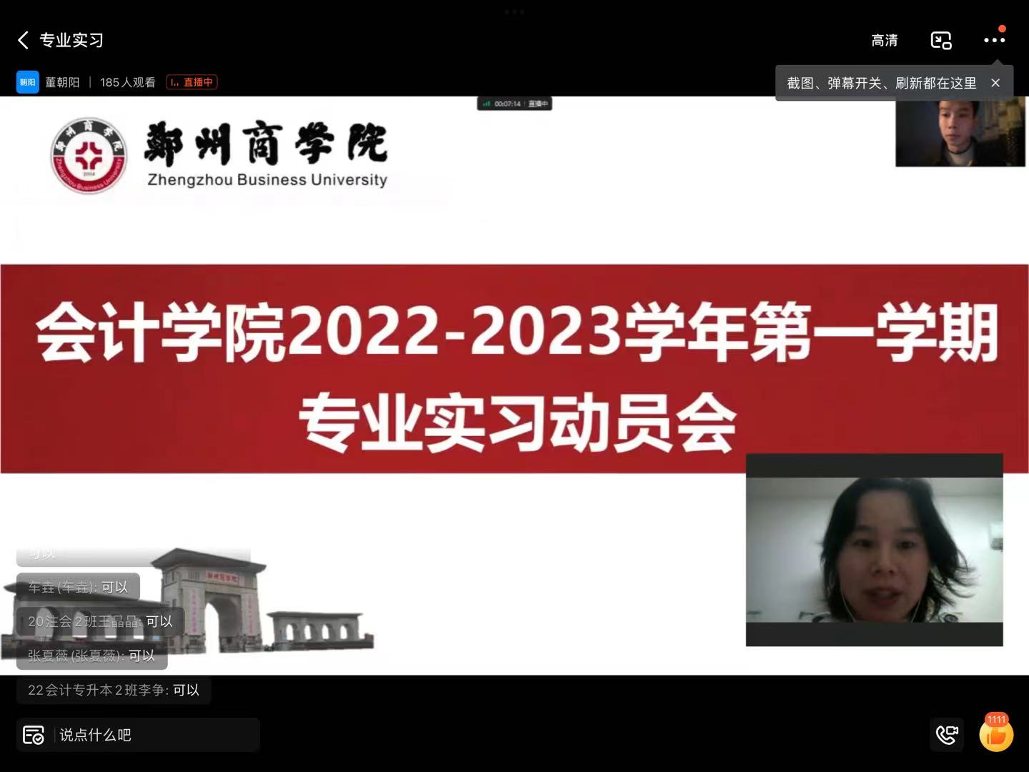 为切实做好会计学院会计学专业学生实习实训工作,全方位提升学生对智能财务场景的应用能力,体验大数据技术给财务类专业带来的影响,保障20级学生的专业实习顺利进行,我院于2022年11月9日借助跃客科技VDC平台开展专业实习,并通过钉钉会议实时转播。会计学院祝利芳院长、刘金金副院长、专业实习指导教师、跃客科技有限公司董朝阳经理还有会计学专业学生参加了此次培训,此次会议由李芳主任主持。