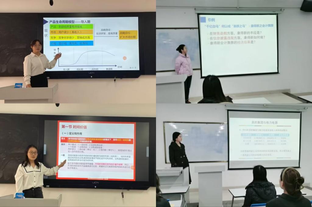 在汇报过程中,新聘教师围绕授课内容、授课方法等方面展开。例如,陈雪华老师讲授的《公司战略和风险管理》,课件制作简洁清晰,重点突出,图文并茂;胡艳梅老师讲授的《财务管理》,教学内容安排合理,教学方法采用理论讲授与课堂练习相结合的方式,汇报时胡老师教态自然,声音洪亮;马川君老师讲授的《会计职业道德》,融入当下热点案例,贴近生活,能够激发学生兴趣,从而提升课堂活跃度;王伟慧老师讲授的《财务分析》,涉及到较多的计算,王老师对各种指标的计算方法进行了总结归纳,能够达到良好的教学效果。汇报结束后,导师和教学名师主要针对授课方法和教学设计方面进行了点评和指导,各小组成员对说课中的亮点和问题进行了积极的讨论,并分享了自己的备课过程、教学方法等。