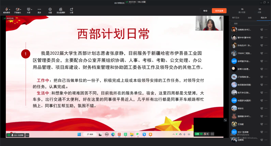 为进一步加强校友与母校的联系,促进母校与各地区校友的沟通,搭建母校与校友、校友与学生之间的互动交流平台,充分发挥校友在帮助我院学子树立正确人生观、价值观及如何理性择业、就业与创业方面的示范和导向作用,帮助同学们明确职业规划、了解职业选择,激励广大在校学生努力学习,励志成才。会计学院于5月9日组织开展了《校友开讲啦》第六期②。我院优秀校友张彦静与在校师生共话成长,学院全体辅导员老师和200余名学生在线参加活动。