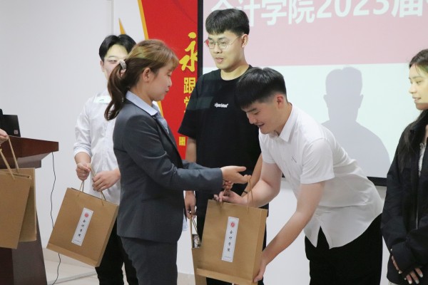 大会第三项,颁奖仪式。祝利芳院长、刘金金副院长及武佳莉老师分别为参会的优秀考研学子颁发学院精心准备的考研纪念品。