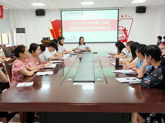 为保障我院期末教学工作秩序,确保2022-2023学年第二学期期末考试工作顺利进行,我院于6月25日下午在会议室召开期末考试考前培训会,明确监考职责以及注意事项。会计学院院长祝利芳、副院长刘金金、全体教师参加此次会议。