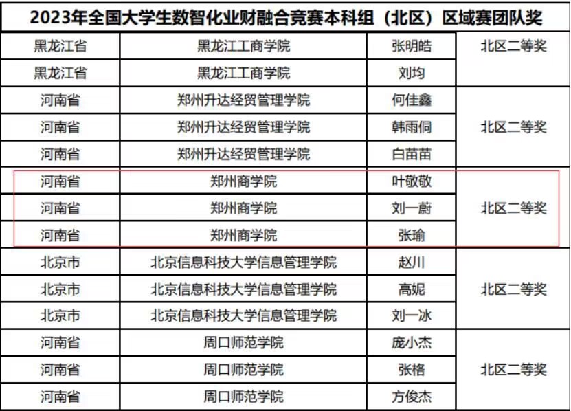 11月2日,2023年全国大学生数智化业财融合区域赛(本科组)成绩公布,根据获奖名单,我院由叶敬敬、张瑜和刘一蔚三名学生组成的参赛队伍荣获北区二等奖。