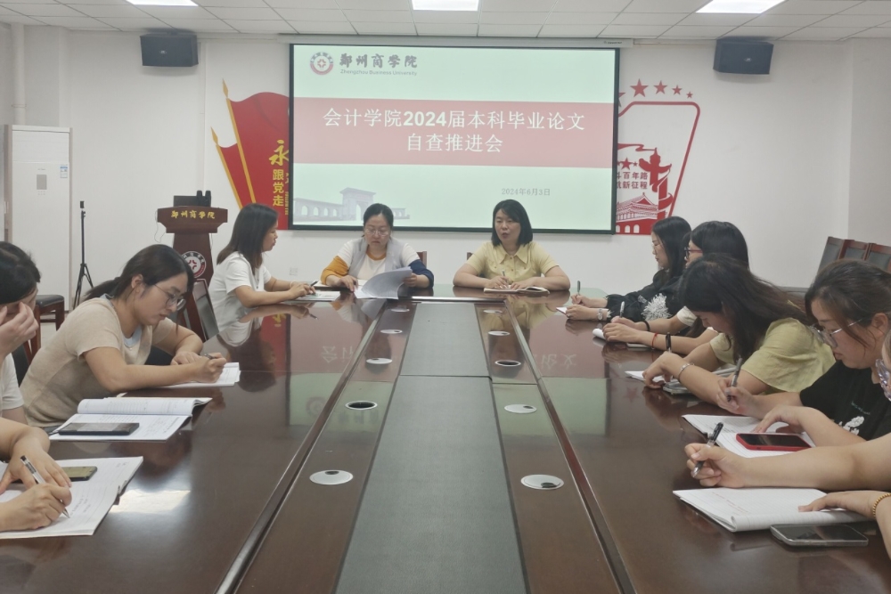 为进一步加强毕业论文质量管理,按照学校毕业论文工作安排,在学院自查、学校抽查的基础上,根据整改意见,于6月3日下午在广恩大楼103会议室专项召开2024届本科毕业论文自查推进会,再次对2024届本科毕业论文进行全面检查。本次会议由会计学院院长祝利芳、副院长刘金金及各教研室主任、骨干教师参加。