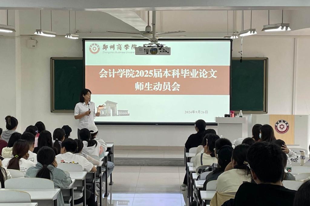 为规范毕业论文写作要求,保证毕业论文写作质量,加强学术诚信建设,提高师生重视程度,会计学院于09月26日在广恩楼顺利召开2025届本科毕业论文师生动员部署会,参与此次动员会的有会计学院院长祝利芳、副院长刘金金、全体毕业论文指导教师及2025届全体在校本科毕业生。