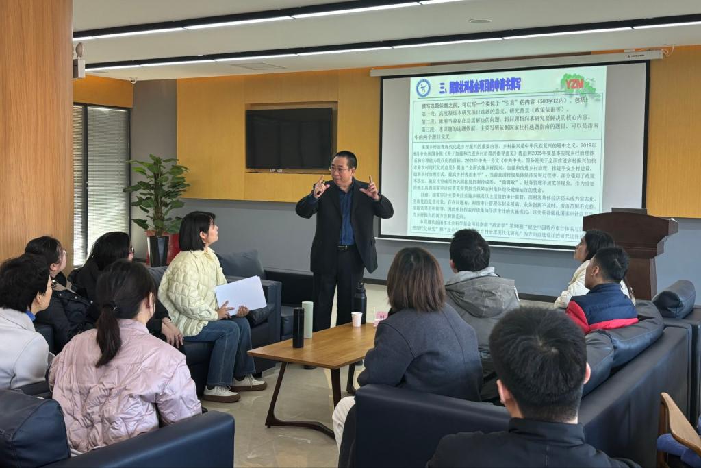 指导会上,叶教授依托国家社科基金项目,围绕申报组织、评审流程、选题论证、申请书撰写四个方面展开经验交流。叶教授首先强调选题是第一位的,重点阐述了选题的重要性,提出高级别项目申报选题要满足新颖性,涵盖新理论、新方法、新角度等;要体现时代性,立足国家重大政策或战略问题、立足经济社会重点、热点、焦点问题;要富有简洁性,高度概括,精简凝练核心思想、核心内容;要凸显专业,具有可驾驭的能力。