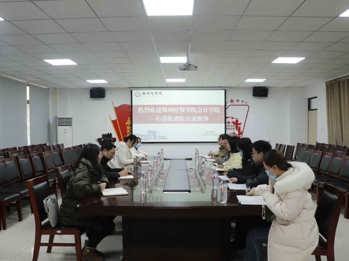 推动专业建设,加强校际间交流合作12月25日上午,郑州经贸学院会计学院院长齐明霞、副院长马锐锋等一行莅临我院交流学习,我院书记刘宏涛、副院长刘金金、教研室主任李芳和段培鸽等人参加了本次交流会。
