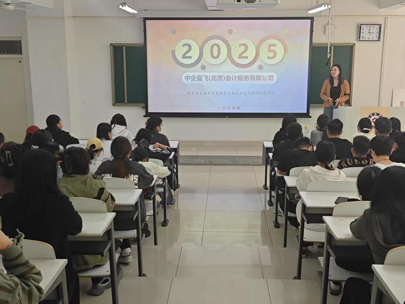 本次宣讲会分为企业宣讲和答疑环节两个部分。活动伊始,中企盈飞经理毕显娟向同学们介绍了公司的自身优势。她指出,公司为实习生提供学徒制就业服务,手把手带教,这有效实现知识在实际工作中的应用,可以提高工作效率,使毕业生更快适应工作。同时,她强调公司还为学生提供岗前培训,帮助学生适应从校园到企业的过渡,优化知识与实践的配对。随后毕经理通过实拍照片向同学们展示了公司为员工提供的干净整洁的工作环境和现代化办公区域。她还通过视频的方式介绍了公司举办的团建活动,弘扬了公司人性化的企业文化。