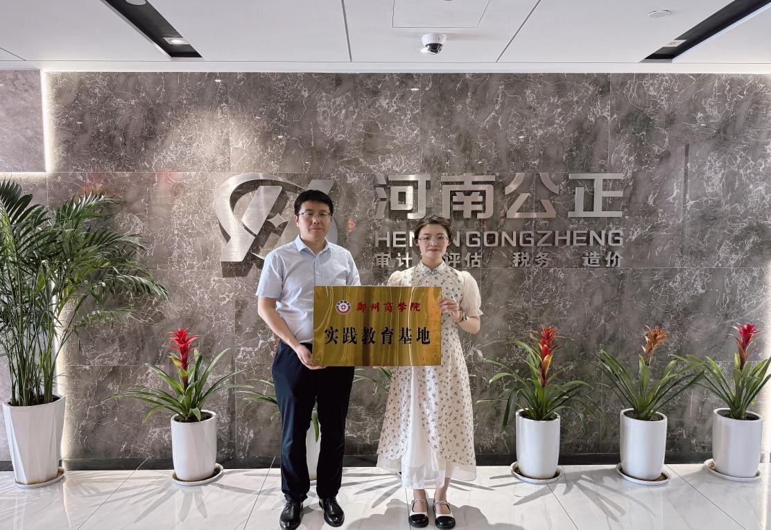 为不断深化产教融合,强化校企协同育人,2025 年 5 月 13 日,我院与河南公正会计师事务所(普通合伙)举行校企实践基地签约暨铭牌授予仪式。河南公正会计师事务所授薪合伙人代表尹诚、河南公正会计师事务所综合部主管张志斐、我院骨干教师代表张漫出席活动。