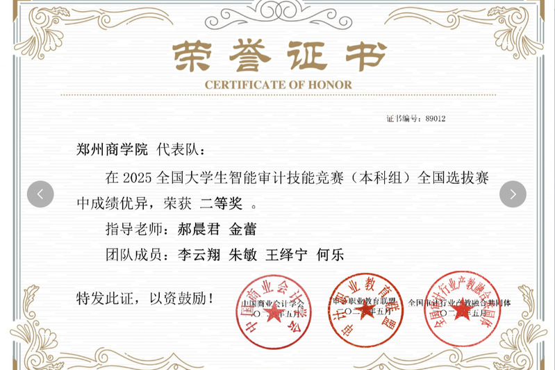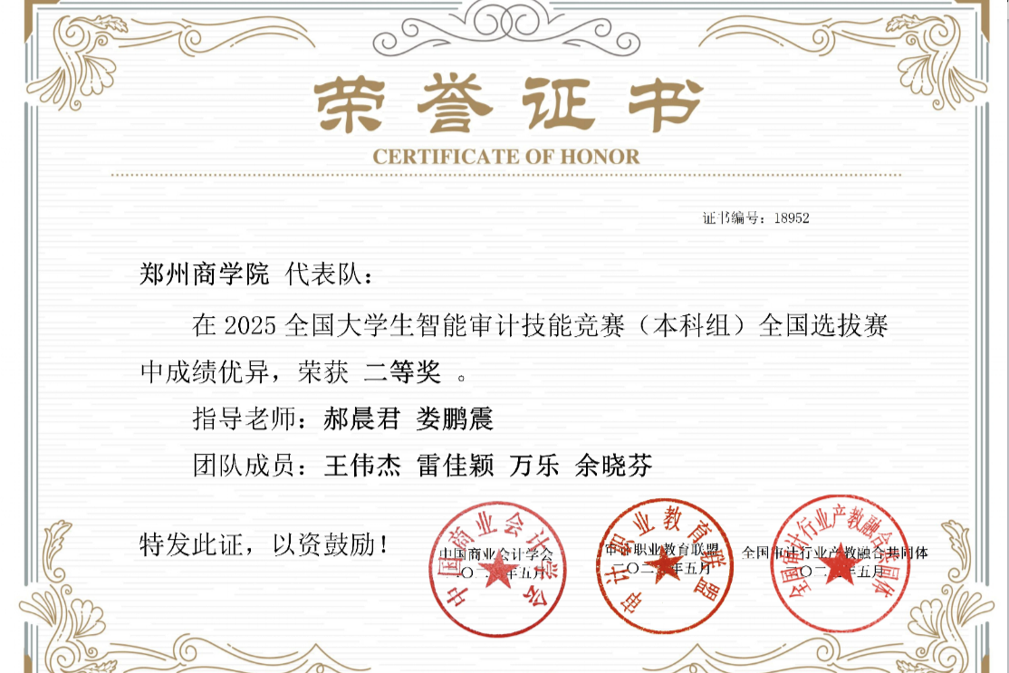5月10日,我院审计学专业的8名学生,组成“智审先锋”、“数审新锐”两支队伍,参加了2025全国大学生智能审计技能竞赛全国选拔赛。比赛以“智能技术+审计实务”双核能力培养为核心,检验学生对审计基本理论知识及实务技能的运用能力。经过全天激烈竞技,我院学子从全国高校参赛队伍中脱颖而出,两支队伍双双荣获二等奖。