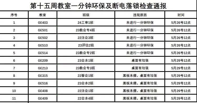 现将本周巡查结果予以公布。希望存在问题的班级能够引起注意,对存在的问题及时改正。