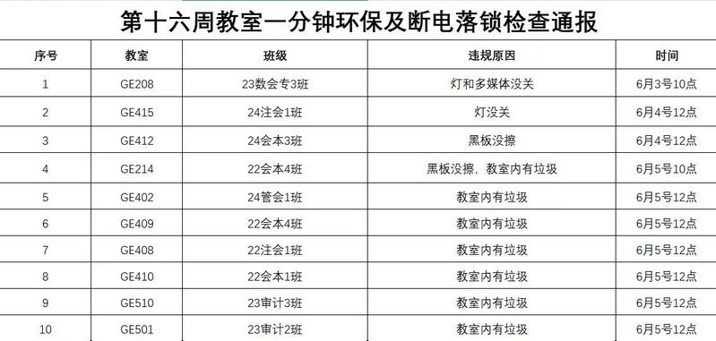 为强化师生环保意识,营造整洁文明的学习环境,我院于第十六周继续组织开展教室卫生环保“一分钟速查”行动。本次检查重点围绕环境卫生、垃圾分类、设备维护等方面展开,以“短平快”的形式推动校园环境精细化管理。