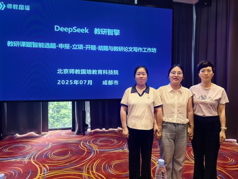为破解我院教师在教研论文写作、教改项目申报中存在的研究方法不系统、智能工具应用不足等痛点,提升教师教学研究能力与学术成果质量,2025年7月21日-24日,我院选派胡珍珍、罗沈娴和郭毅飞三位老师赴成都参加由北京师教国培教育科技院主办的“DeepSeek教研智擎——教研课题智能选题-申报-立项-开题-结题与教研论文写作工作坊”,系统学习AI时代教学研究的创新策略。