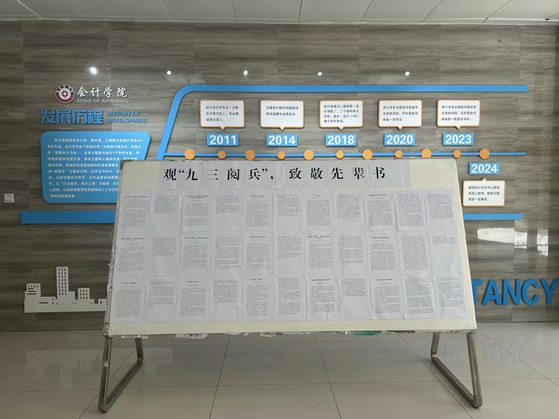 此次活动得到了同学们的积极响应与热情参与,共收到投稿64份。有的作品饱含对革命先辈“舍生取义护家国”的深切缅怀,字里行间浸润着崇高的敬意;有的写下阅兵式中“大国风采彰显民族力量”带来的震撼与触动,一笔一画皆洋溢着由衷的自豪;还有的以文字为媒介,记录下阅兵式上那些让人心潮澎湃的瞬间,将动人画面凝于笔端。展示期间,同学们纷纷驻足品读,交流由文字所激发的情感共鸣,现场处处涌动着对祖国的赤子深情与面向未来的坚定信心。