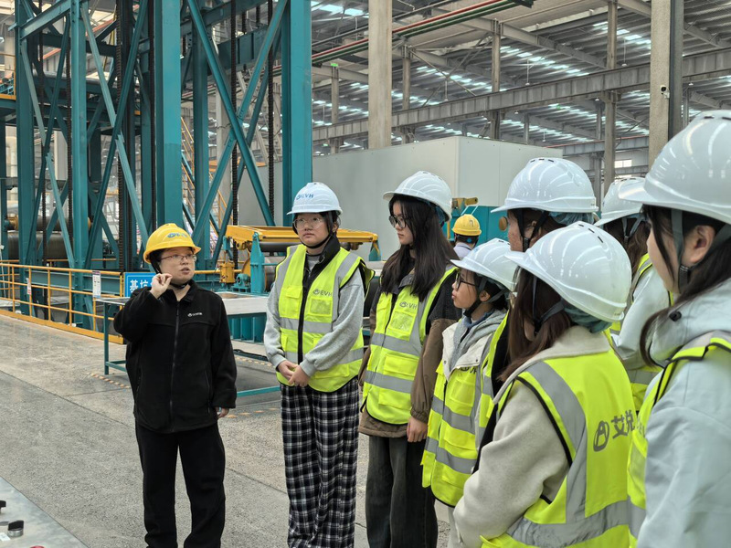 在实习过程中,公司人事经理徐方热情接待并引导同学们依次参观了党建办公室、易拉盖材涂层生产线及纵剪车间。厂区内,国内领先的彩涂铝卷材生产线高速运转,从铝板基材冲压、涂层加工到分切包装,全流程实现自动化作业,仅需少量技术人员监控参数,生产过程井然有序。徐经理介绍,公司凭借自主研发打破了国外技术垄断,产品现已实现出口,并通过回郭镇产业集群的协同效应,在供应链与成本管控方面取得了显著成效。