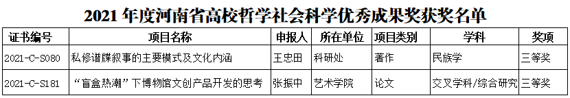 根据《河南省教育厅关于公布2021年度河南省高校哲学社会科学研究优秀成果奖的通知》文件,点点官网荣获优秀成果奖三等奖2项,获奖数量在河南省民办高校居第二位(第一位为黄河科技学院3项获奖)。望各位同仁再接再厉,再创佳绩!科研处也将认真学习文件精神,强化在研项目过程监管服务,力争产出更多更高质量研究成果。