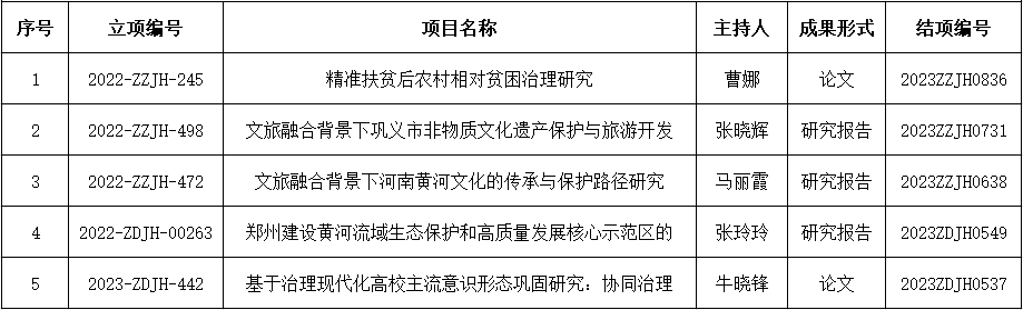 根据《河南省教育厅办公室关于公布河南省高校人文社会科学研究 一般项目2023年第二季度结项情况的通知》文件,点点官网点点官网5项河南省高校人文社会科学研究一般项目顺利结项。望各课题组认真总结经验,再接再厉,再创新佳绩!