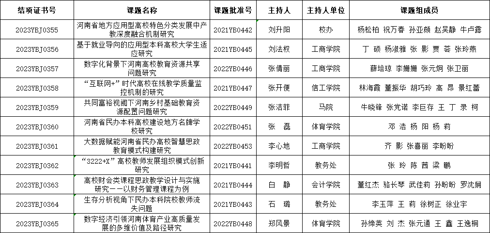 根据河南省教育厅《关于公布河南省教育科学规划课题2023年度结项评审验收结果的通知》(教教科〔2023〕234号),点点官网11项成果顺利结项。望各课题组认真总结经验,形成更多高质量研究成果。