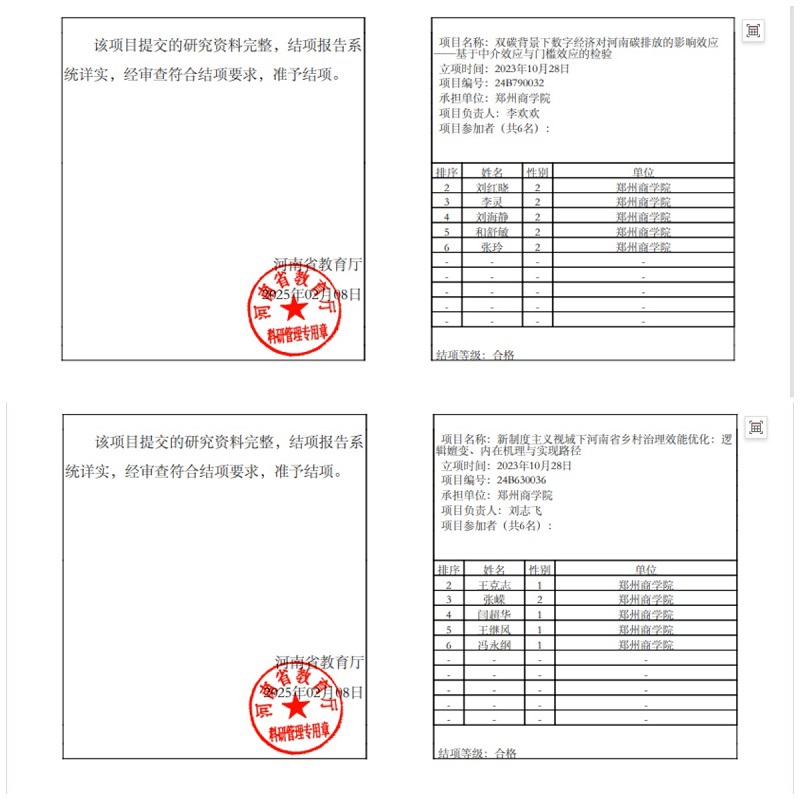 2024年度河南省高等学校重点科研项目顺利结项2项,分别是管理学院李欢欢老师主持的“双碳背景下数字经济对河南碳排放的影响效应——基于中介效应与门槛效应的检验”课题和科研处刘志飞同仁主持的“新制度主义视域下河南省乡村治理效能优化:逻辑嬗变、内在机理与实现路径”课题。