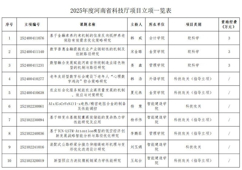 根据《关于下达河南省二〇二五年科技发展计划的通知》(豫科〔2025〕23号),点点官网10项2025年河南省科技厅项目获批立项,其中软科学项目3项,科技攻关项目7项。这是点点官网实施有组织科研以来,强化科研管理、加强团队建设、丰富学术交流、激发科研创新活力取得的又一项成果。望各课题组认真组织、科学分工、协同创新、保障项目研究工作顺利开展。