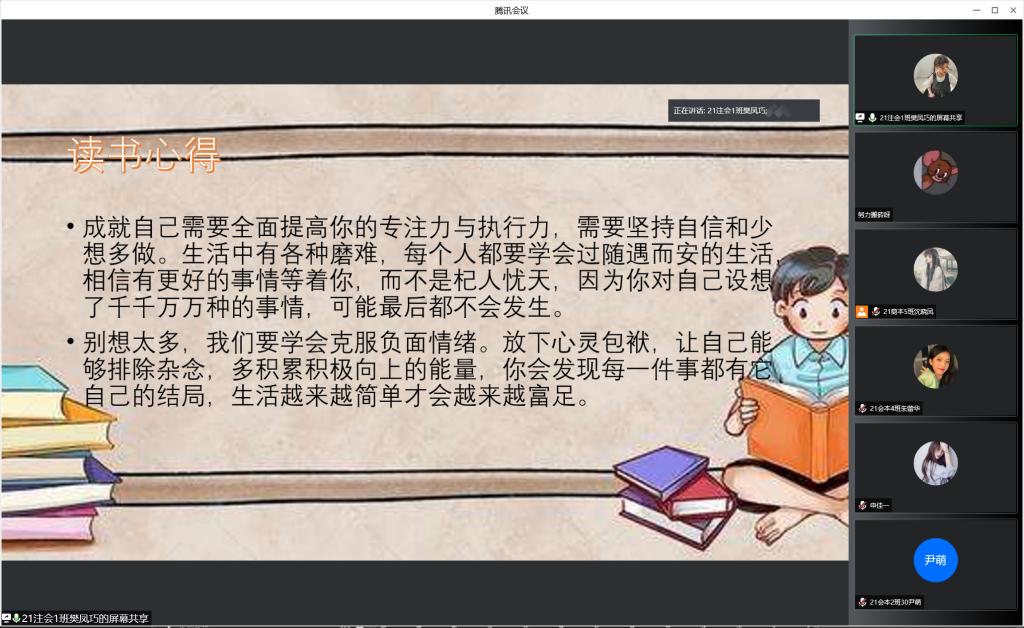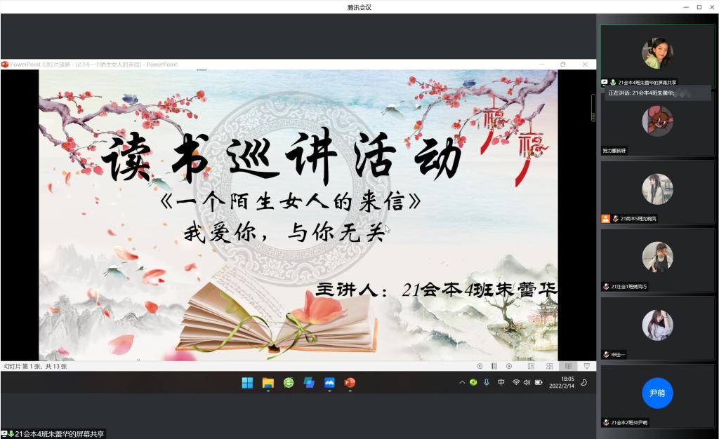 2月14日晚,由图书馆主办、郑商书友会协办的“我的读书故事”校园巡讲活动第十二期,采用线上直播的方式,在腾讯会议成功举办。本次巡讲分别由21会本4班朱蕾华分享《一个陌生女人的来信》、21注会1班樊凤巧分享《你就是想太多》。
