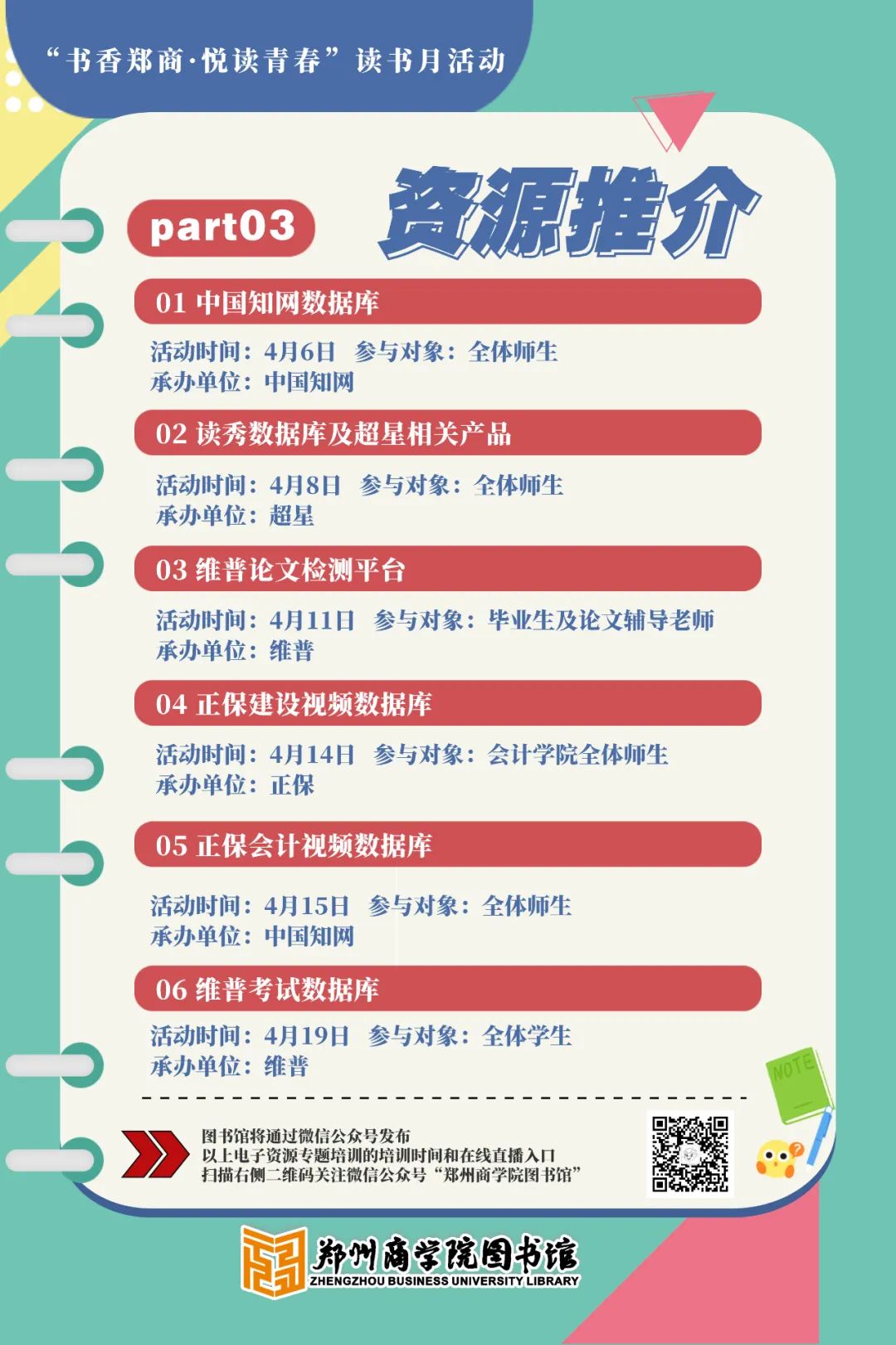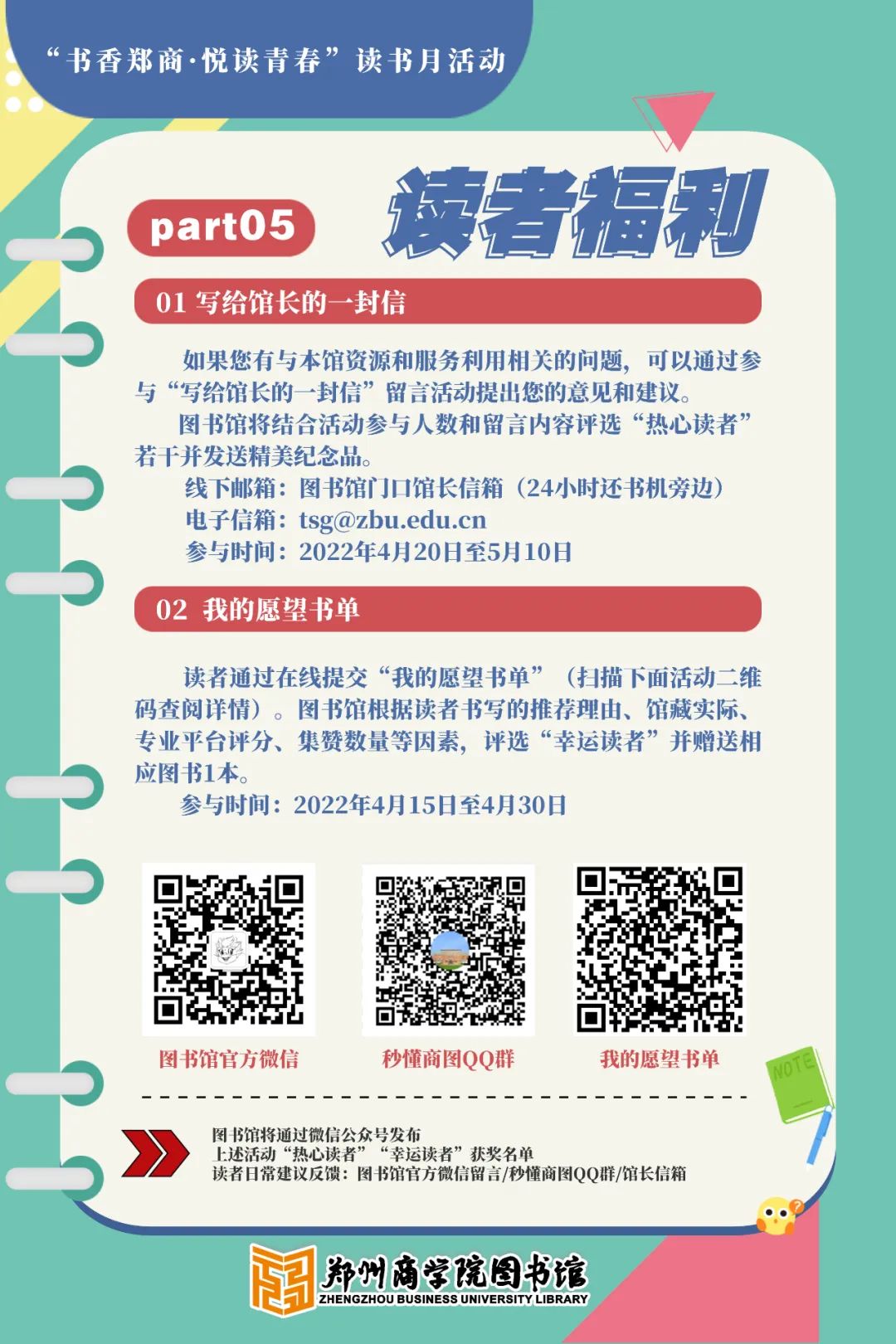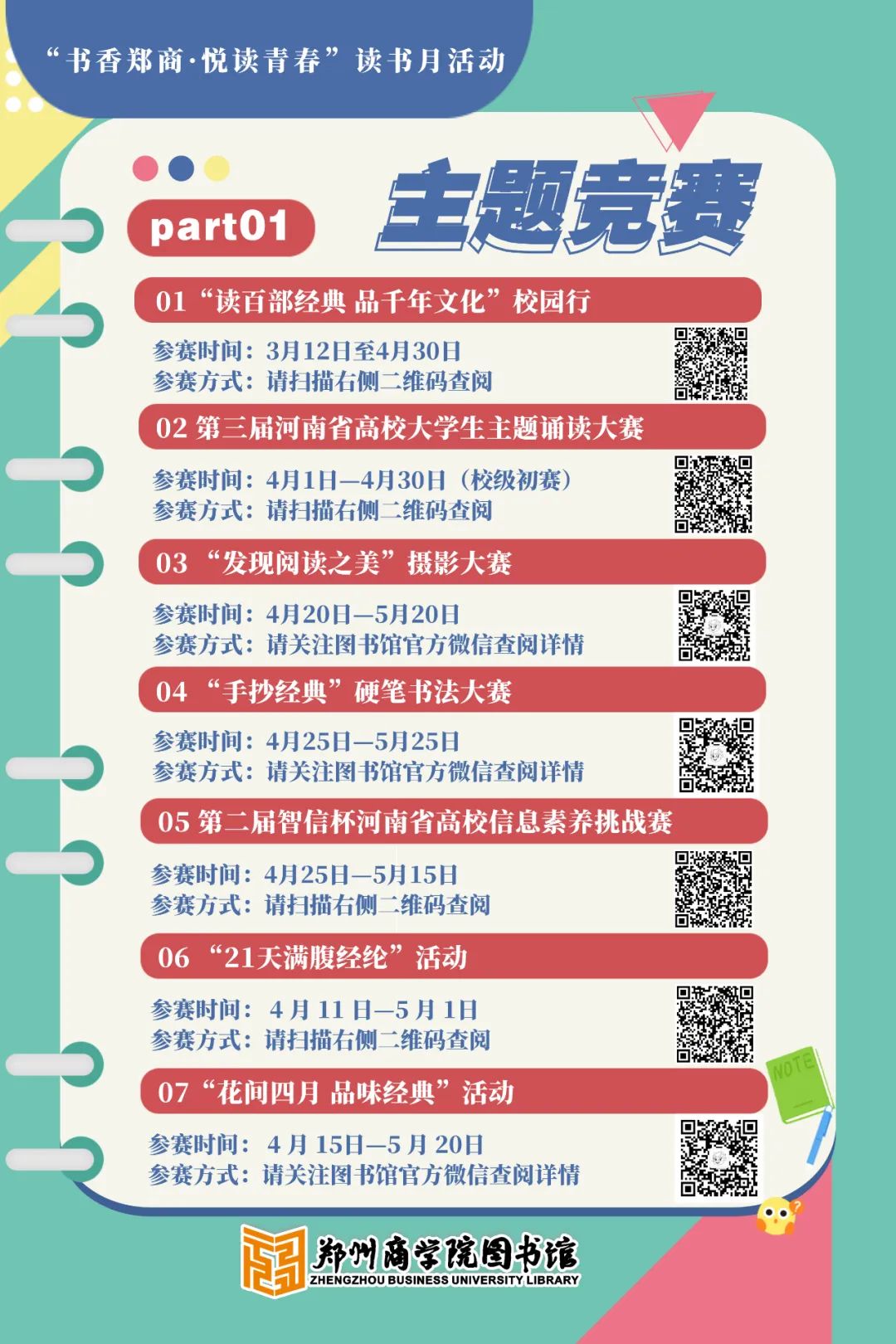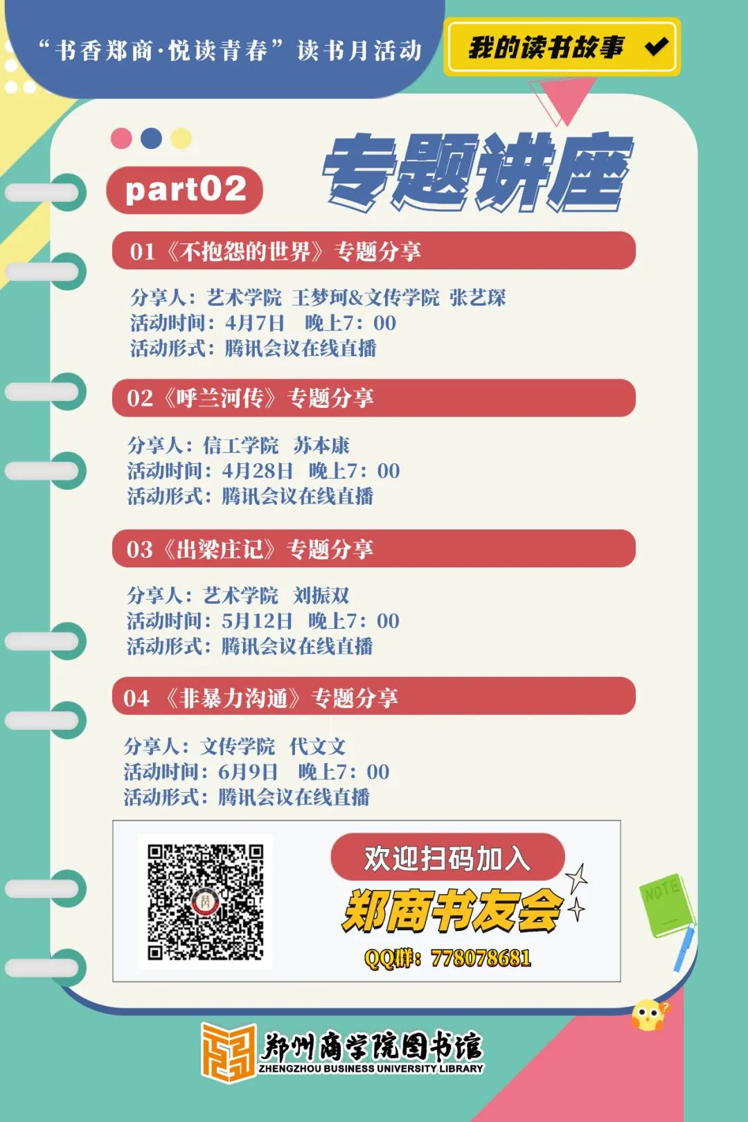 为落实立德树人根本任务,积极推进“书香校园阅读经典工程”的开展,进一步加强学风建设,提升读者阅读素养,构建图书馆协同育人服务体系,在2022年4月23日“世界读书日”即将来临之际,图书馆特举办“书香郑商·悦读青春”读书月系列活动。