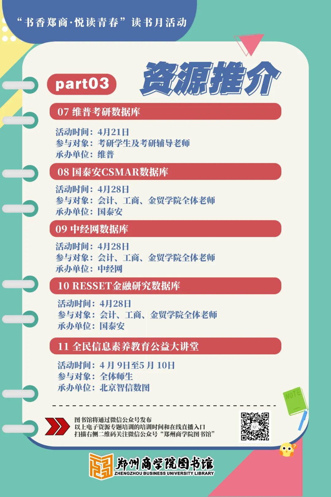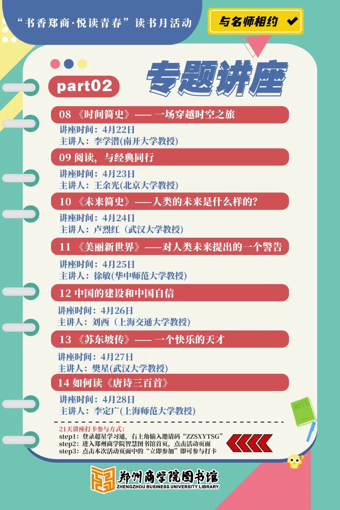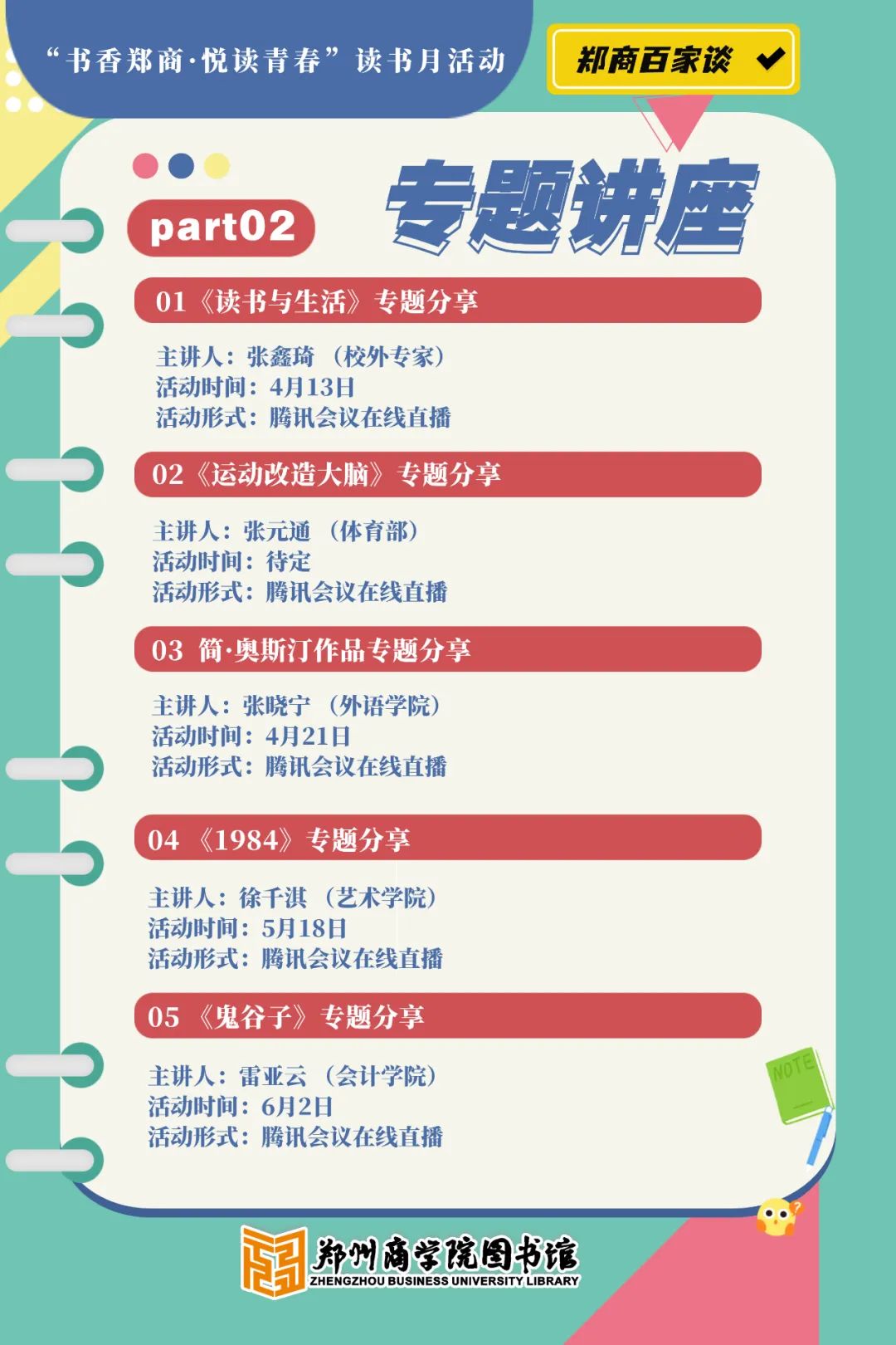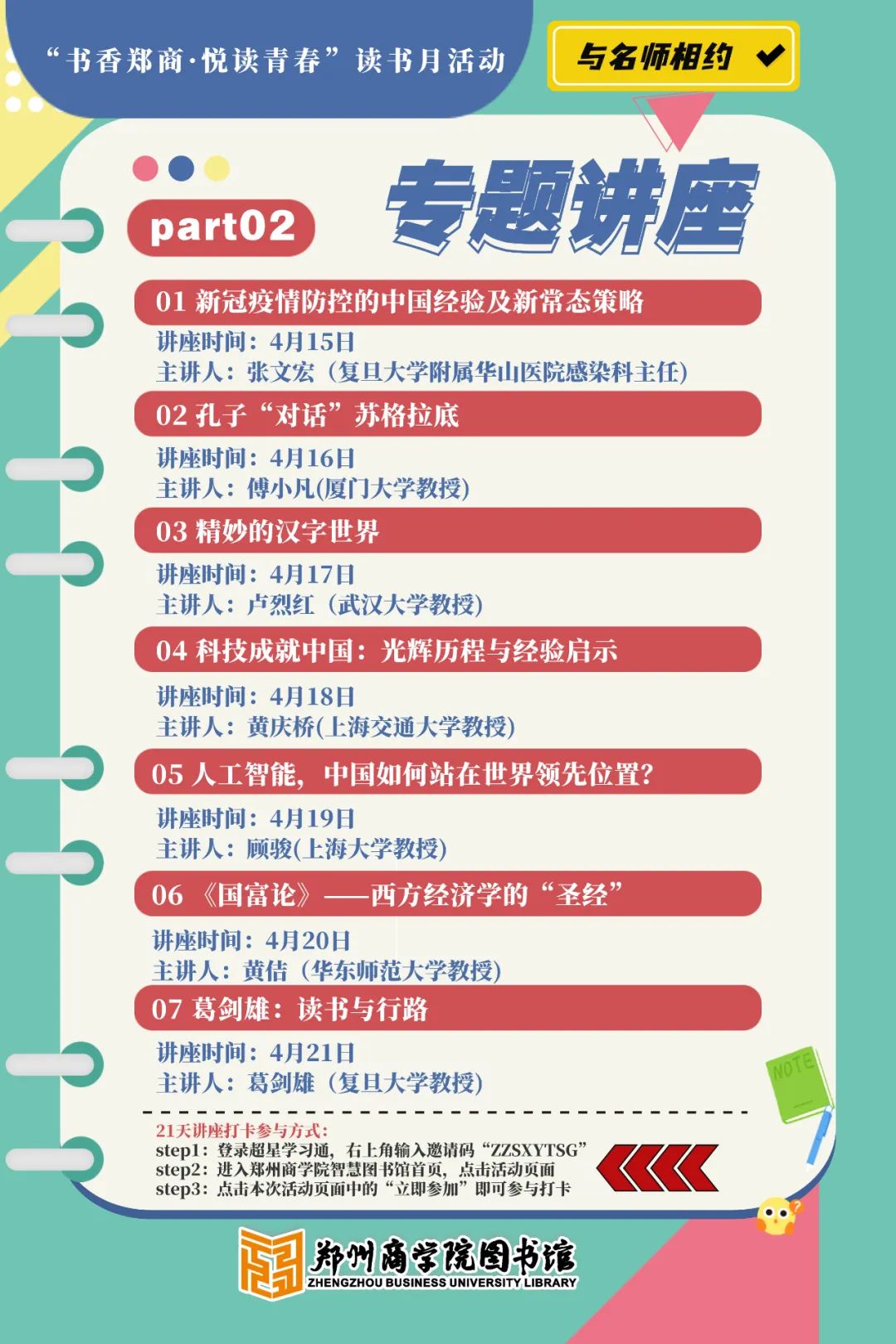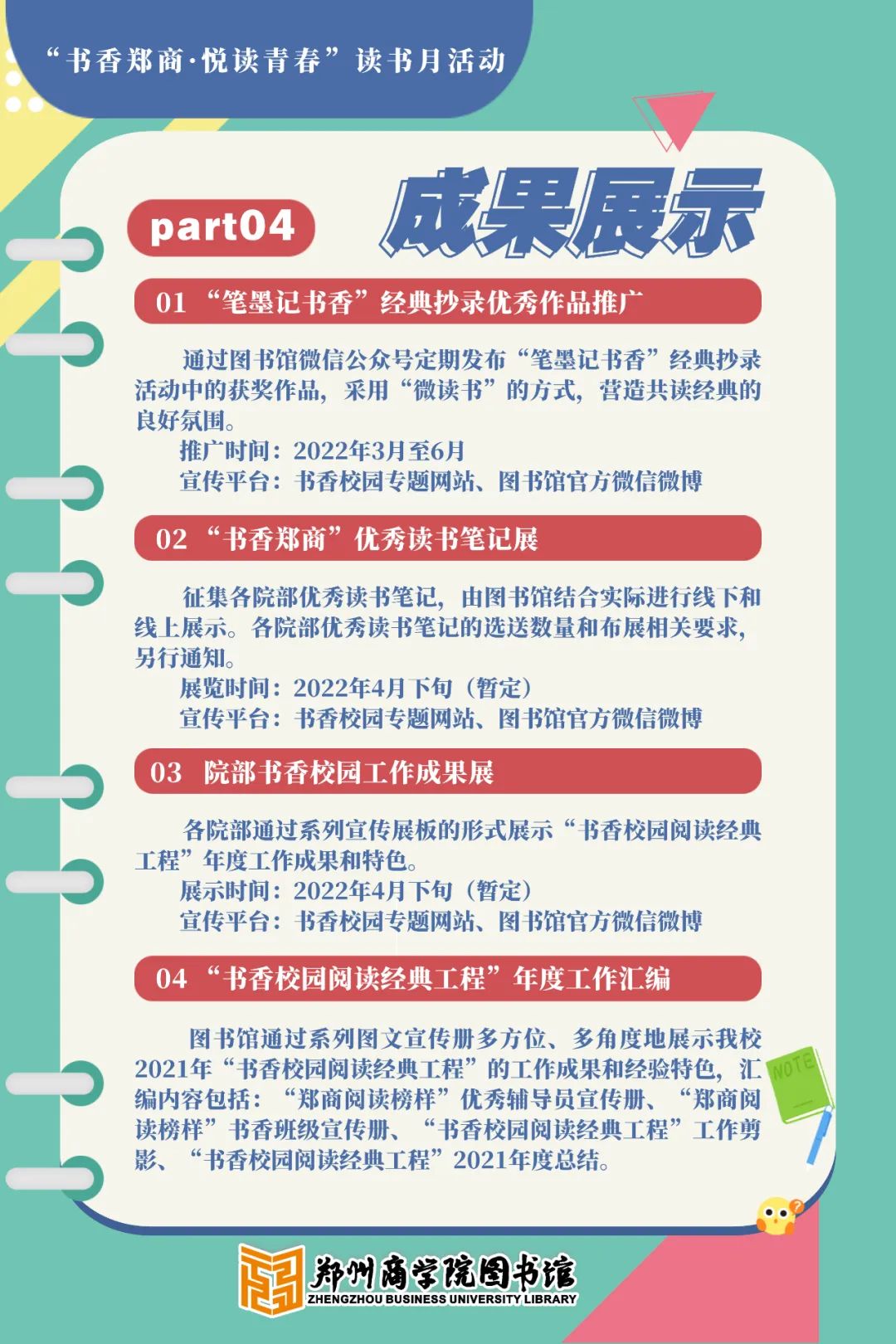 为落实立德树人根本任务,积极推进“书香校园阅读经典工程”的开展,进一步加强学风建设,提升读者阅读素养,构建图书馆协同育人服务体系,在2022年4月23日“世界读书日”即将来临之际,图书馆特举办“书香郑商·悦读青春”读书月系列活动。