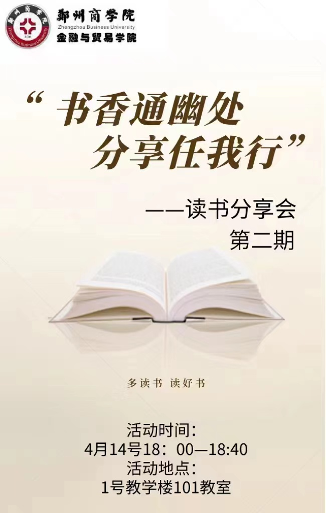 金贸学院于4月14日开展“书香通幽处,分享任我行”读书分享会活动。此次活动由金贸学院读书分享宣讲团成员共同参与,进一步激发了学生的阅读热情,提高了学生们的表达能力,让学生感受到了阅读的魅力,促使学生养成终身阅读的习惯。