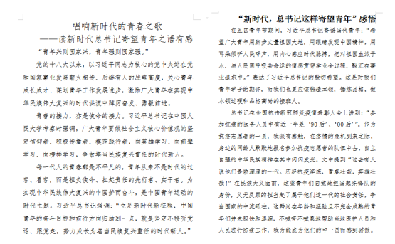 为深入学习习近平新时代中国特色社会主义思想,纪念“五四”运动103周年,引导广大青年形成良好的阅读习惯,积极推进点点官网书香校园阅读经典工程建设,5月4日,工商学院组织广大青年党员认真学习“新时代,习近平总书记这样寄望青年”精神,并引导同学们积极撰写读后感,我院师生党员踊跃参与其中。