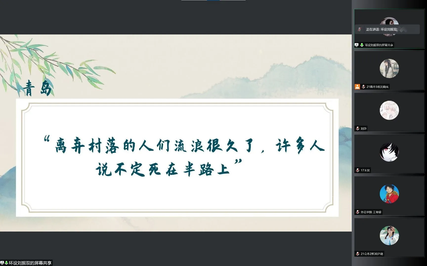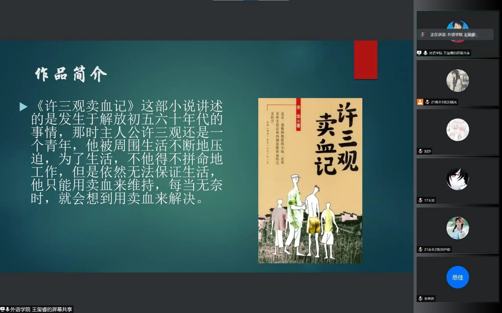 如果说《奇风岁月》带给我们的是人性的感悟与享受,那接下来王玺睿同学分享的《许三观卖血记》给我们更多的是人性的写照。正如王玺睿同学所说的那样,主人公许三观生活的时代是一个让人揪心的时代,除了生活的艰辛外,人与人之间的互相折腾更让人感动和痛心。因为爱和责任,许三观不得不一次又一次选择了这条路,不仅尽显生活的风霜雨雪,更是凄凉的真实写照。