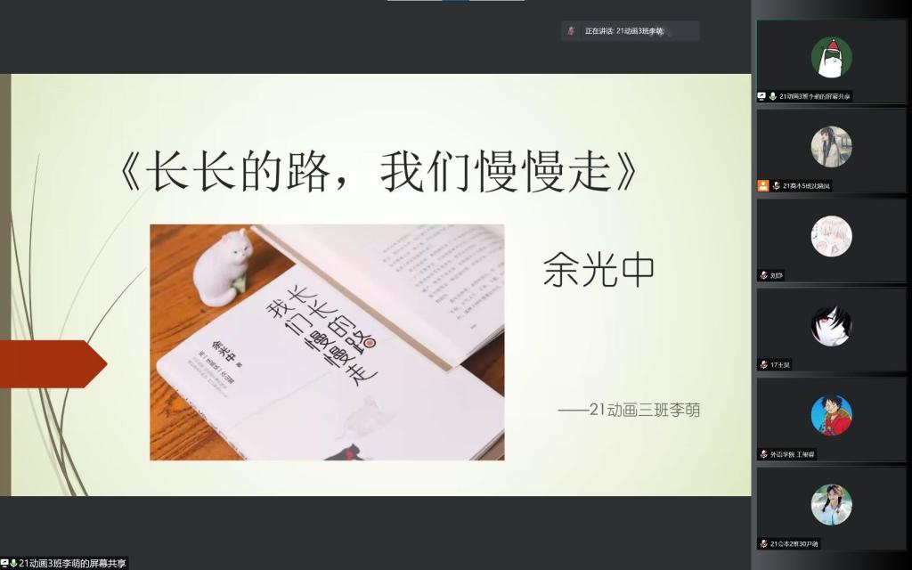 为推动“书香校园阅读经典工程”建设,引导学生阅读经典。5月12日晚由图书馆主办,郑商书友会协办的“我的读书故事”校园巡讲第十六期活动,通过腾讯会议成功举办。本次巡讲采用线上直播的方式,向大家分享了四本书籍, 分别是来自艺术学院21视专2班刘铮同学分享的《奇风岁月》、外国语学院21专升本英语1班王玺睿同学分享的《许三观卖血记》、艺术学院19环设4班刘振双同学分享的《出梁庄记》和艺术学院21动画3班李萌同学分享的《长长的路,我们慢慢走》。