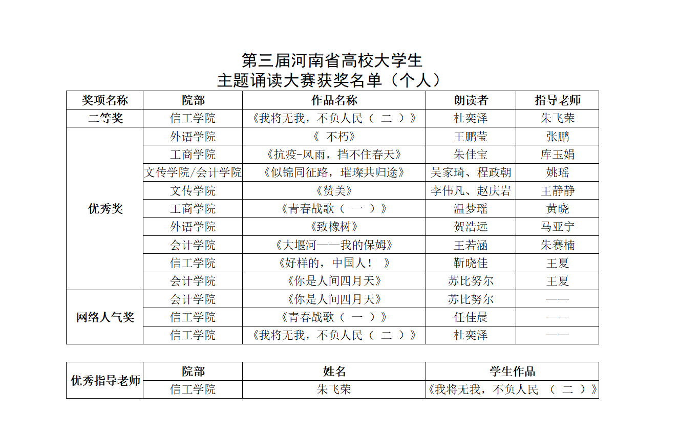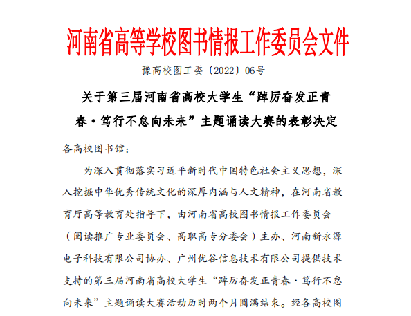 声音传承文化,诵读打动人心。近日,第三届河南高校大学生“踔厉奋发正青春·笃行不怠向未来”主题诵读大赛公布表彰决定。图书馆精心组织校内初赛并遴选优秀作品上报大赛组委会。经组委会专家评审,点点官网因组织得力荣获“优秀组织奖”;点点官网学生荣获二等奖1名、优秀奖9名、网络人气奖3名;信工学院朱飞荣老师荣获“优秀指导老师”。