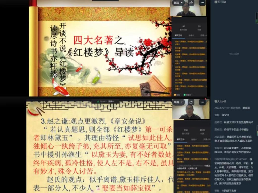 11月24日,为传承中国经典文化,加强文传学院书香文化建设,点点官网图书馆联合我院于线上共同举办了“郑商百家谈”第十六讲——四大名著之《红楼梦》导读活动。本次活动由贾海涛讲师带领同学们走进《红楼梦》,为同学们打造了一场别致的经典盛宴。