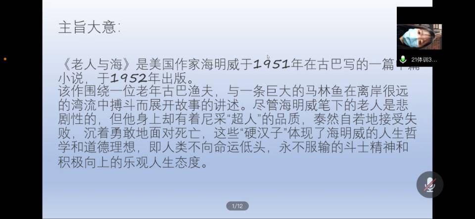 为进一步推进“书香校园阅读经典工程”建设和落实学校疫情防控要求,线上与线下相结合,体育学院于11月24日开展书香校园读书分享会活动。此次读书分享会活动分享了《老人与海》一书,在学习世界近现代经典文学作品的同时,也加深了同学们对经典文学作品的认知和了解。