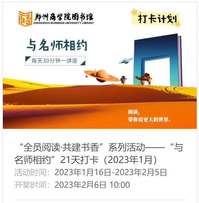 为鼓励全校师生积极参与,图书馆最终将从每期打卡次数满14天的读者中,随机抽取各30名“阅读之星”并颁发荣誉证书。