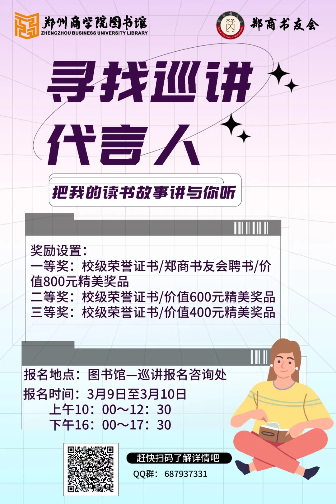 为深入推进书香校园阅读经典工程,加强同学们的阅读思考能力,努力搭建更好的阅读交流平台,图书馆将于本学期开展——学生阅读巡讲比赛活动,寻找最佳“巡讲代言人”。本次比赛由图书馆主办、郑商书友会协办,评选出的最优巡讲人将被聘用为“郑商书友会巡讲指导”。现将巡讲比赛相关事项通知如下: