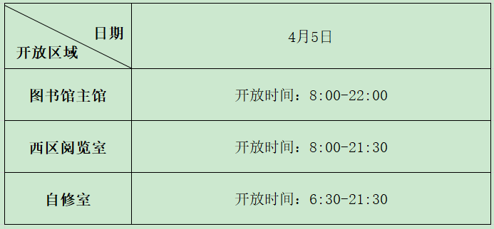 根据学校通知,4月5日为“清明节”假期。为方便假期读者借阅,图书馆清明节假期开放时间如下: